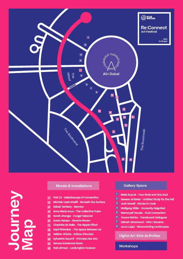 حرف "RE:" في Re:connect يعبر عن التحول والتجديد. إنها دعوة لإعادة إشعال الإلهام، وإعادة اكتشاف المحادثات، وإعادة رسم العالم من خلال الفن. سواء كنت عاشقاً للفن أو مجرد مستكشف يبحث عن تجارب جديدة، يعدك مهرجان بلوواترز للفنون برحلة مليئة بالإبداع والحياة.